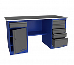 Верстак двухтумбовый поставляется в разобранном виде (4 элемента). Нагрузка на столешницу до 600 кг. Стандартный цвет: корпус - серый глянец RAL 7030, ящики и двери тумб - синий RAL 5017.  Размеры: 855x1600x700 мм. Масса: 83 кг.