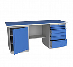 Двухтумбовый. Допустимая нагрузка на столешницу 1000 кг. Опорные элементы выполнены сварными из холоднокатаной стали. Для выполнения сборочных, ремонтных, слесарных, монтажных и других видов работ на производстве, в сервисных центрах, мастерских, гаражах, а также для обучения технологии в учебных заведениях. Комплектуется полкой-стенкой, расположенной под столешницей для удобного размещения габаритного инструмента и оснастки. Размеры верстака: 855x1796x696 мм. Вес: 87 кг. Поставляется в 4 комплектациях на выбор.