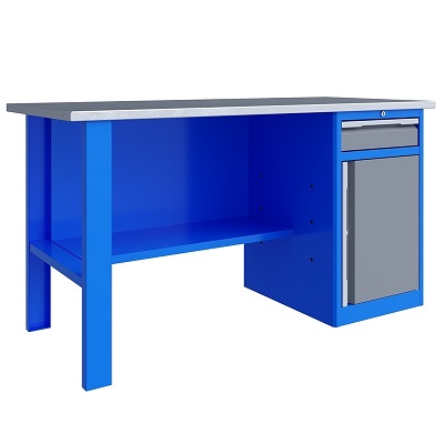 Верстак однотумбовый поставляется в разобранном виде. Нагрузка на столешницу до 600 кг. Стандартный цвет: корпус - серый глянец RAL 7030, ящики и двери тумб - синий RAL 5017. Размеры:855x1400x700 мм. Вес: 62 кг.