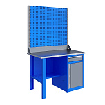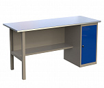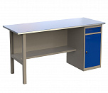 Однотумбовый. Допустимая нагрузка на столешницу 750 кг. Опорные элементы выполнены сварными из холоднокатаной стали. Верстак состоит из столешницы, опоры, тумбы P7 с дверью, полки-стенки и одинарного экрана с кронштейнами. Все металлические элементы покрыты полиэфирной порошковой краской. Столешница состоит из фанеры марки ФСФ толщиной 24 мм, которая покрыта лаком-антисептиком и листом оцинкованной холоднокатаной стали толщиной 1,2 мм. Размеры (ВхШхГ) 1470x1196x696 мм.