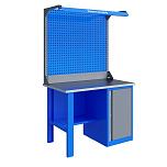 Однотумбовый. Допустимая нагрузка на столешницу 750 кг. Опорные элементы выполнены сварными из холоднокатаной стали. Верстак состоит из столешницы,опоры, тумбы P7 с дверью, полки-стенки, двойного экрана с кронштейнами и комплекта освещения. Все металлические элементы покрыты полиэфирной порошковой краской. Столешница состоит из фанеры марки ФСФ толщиной 24 мм, которая покрыта лаком-антисептиком и листом оцинкованной холоднокатаной стали толщиной 1,2 мм. Размеры (ВхШхГ) 1965x1196x696 мм.