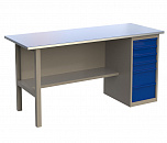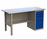 Однотумбовый. Допустимая нагрузка на столешницу 750 кг. Опорные элементы выполнены сварными из холоднокатаной стали. Верстак состоит из столешницы, опоры, тумбы P5 с четырьмя малыми и одним большим ящиком и полки-стенки. Все металлические элементы покрыты полиэфирной порошковой краской. Столешница состоит из фанеры марки ФСФ толщиной 24 мм, которая покрыта лаком-антисептиком и листом оцинкованной холоднокатаной стали толщиной 1,2 мм. Размеры (ВхШхГ) 855x1396x696 мм.
