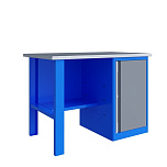 Однотумбовый. Допустимая нагрузка на столешницу 750 кг. Опорные элементы выполнены сварными из холоднокатаной стали. Верстак состоит из столешницы, опоры, тумбы P8 с малым ящиком и отделением с дверью и одной полкой, полки-стенки и одинарного экрана с кронштейнами. Все металлические элементы покрыты полиэфирной порошковой краской. Столешница состоит из фанеры марки ФСФ толщиной 24 мм, которая покрыта лаком-антисептиком и листом оцинкованной холоднокатаной стали толщиной 1,2 мм. Размеры (ВхШхГ) 1470x1196x696 мм.
