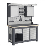 Нагрузка на столешницу 1500 кг. Столешница из листа влагостойкой фанеры марки ФСФ толщиной 40 мм и листом горячекатаной стали толщиной 5 мм. Рама верстака выполнена их холоднокатаной стали. Модуль верстака выполнен сварными. Ящики в модулях устанавливаются на шариковых телескопических направляющих полного выдвижения. Квадратная перфорация для установки крючков, держателей. Размеры: 1982x1993x743 мм.