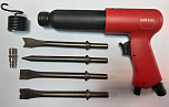 Компактный и мощный инструмент. Корпус выполнен из легкого и прочного алюминиевого сплава. Для выполнения ударных, режущих и рубящих работ или удаления заклепок, снятия слоя старого покрытия. При длине 130 мм частота ударов молотка составляет 4300 уд/мин. Рабочий ход составляет 43 мм. В комплект поставки входят 2 стальных зубила.