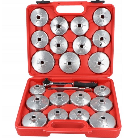 Головки изготовлены из стали. Масляный съемник "чашка" - набор 23 предмета. Применяется с инструментом под квадрат 1/2" или ключом 21 мм. В комплекте: 21 головка для масляного фильтра + трещоточный ключ на ½" + накидной ключ 21 мм, 12 гранный.