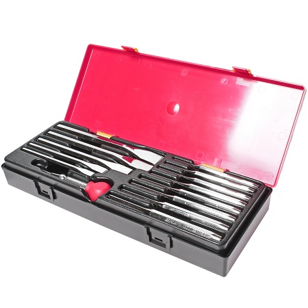 Набор выколоток и зубил с кернером в кейсе 5 предметов. В комплекте: выколотка: Ø 4 мм, зубило: 5 мм, ручное зубило: 12 мм, кернер: Ø 4 мм, зубило конусообразное: Ø 3 мм