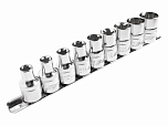 Головки изготовлены из закаленной хром-ванадиевой стали. Полированная поверхность. В набор входит планка крепления и хранения головок.Набор 9 предметов (Е10, Е11, Е12, Е14, Е14, Е16, Е18, Е20, Е22, Е24).