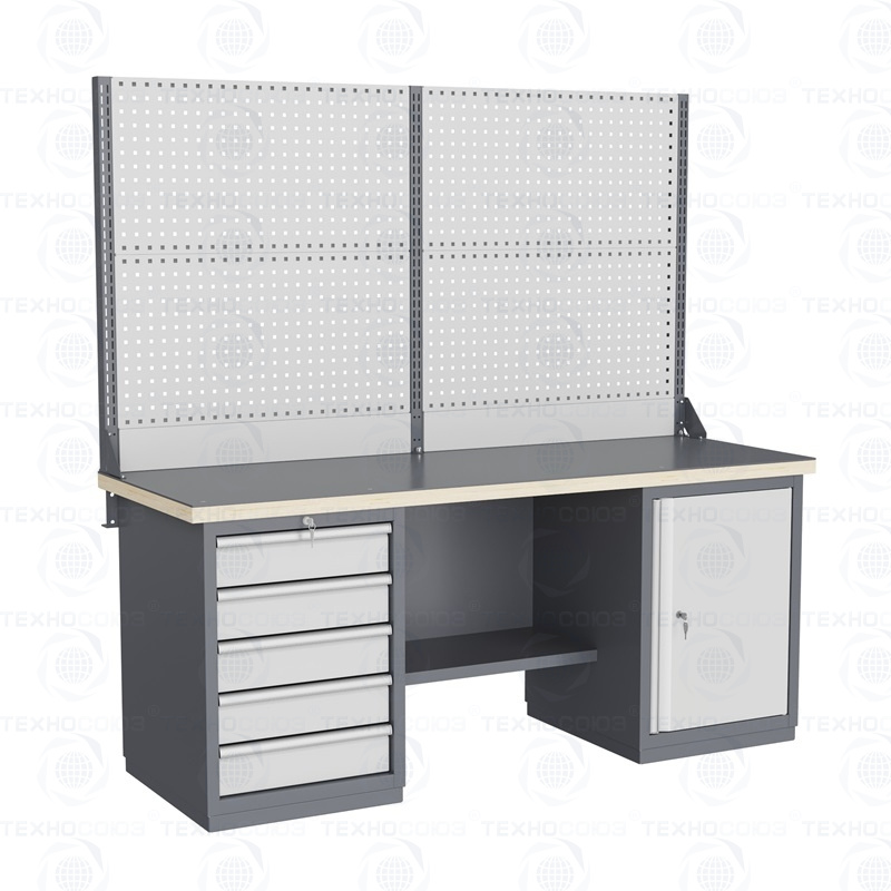 Верстак может комплектоваться одинарным или двойным перфорированным экраном, электромонтажным блоком для установки розеток и дополнительных устройств, а также комплектом освещения с держателем и лампой. Перфорация экрана подходит под стандартные держатели для инструментов, отверток, крючков, полок. Возможна комплектование верстака навесным элементами (держатели, крючки, полки).