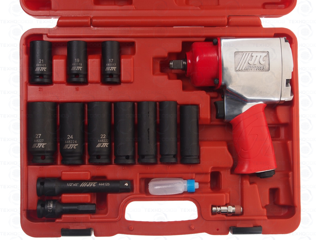 JTC-7663K2 НАБОР ИНСТРУМЕНТОВ ДЛЯ ШИНОМОНТАЖА (ПНЕВМОГАЙКОВЕРТ JTC-5812 1/2" 1085НМ) 15 ПРЕДМЕТОВ В комплекте: гайковерт ударный пневматический. Размер квадрата: 1/2" (12.7 мм). Максимальный крутящий момент: 1084 Н·м. + головки + удлинитель + штуцер + смазка. 15 предметов.