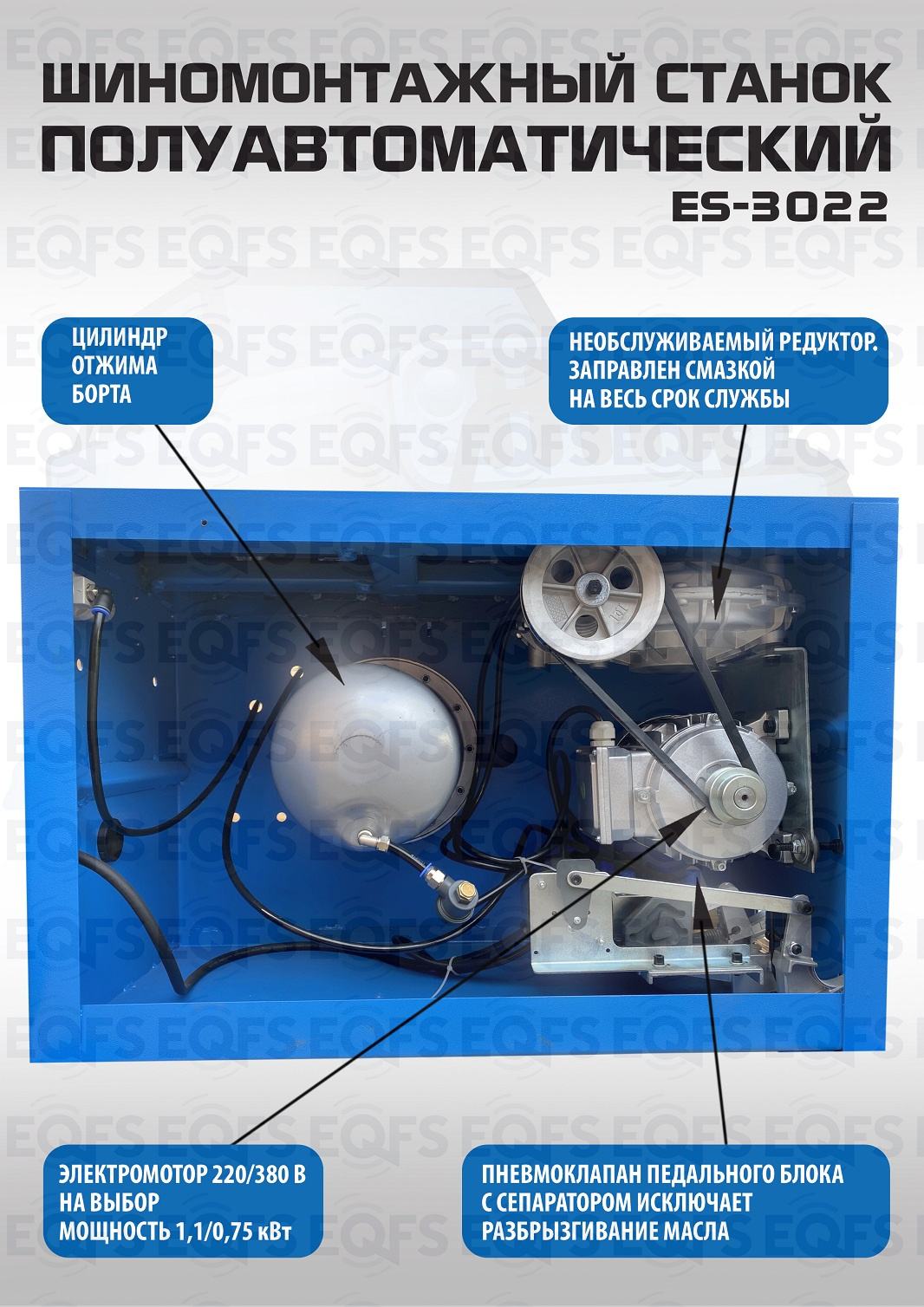 ES-3022 станок шиномонтажный полуавтомат. Внешний зажим 11-21”. Внутренний зажим 12-24”. Поставляем на 220В и 380В. В комплекте: пистолет для подкачки шин + монтажка + регулятор давления с влагоотделителем и манометром. Рекомендуется для постов со средней и высокой проходимостью