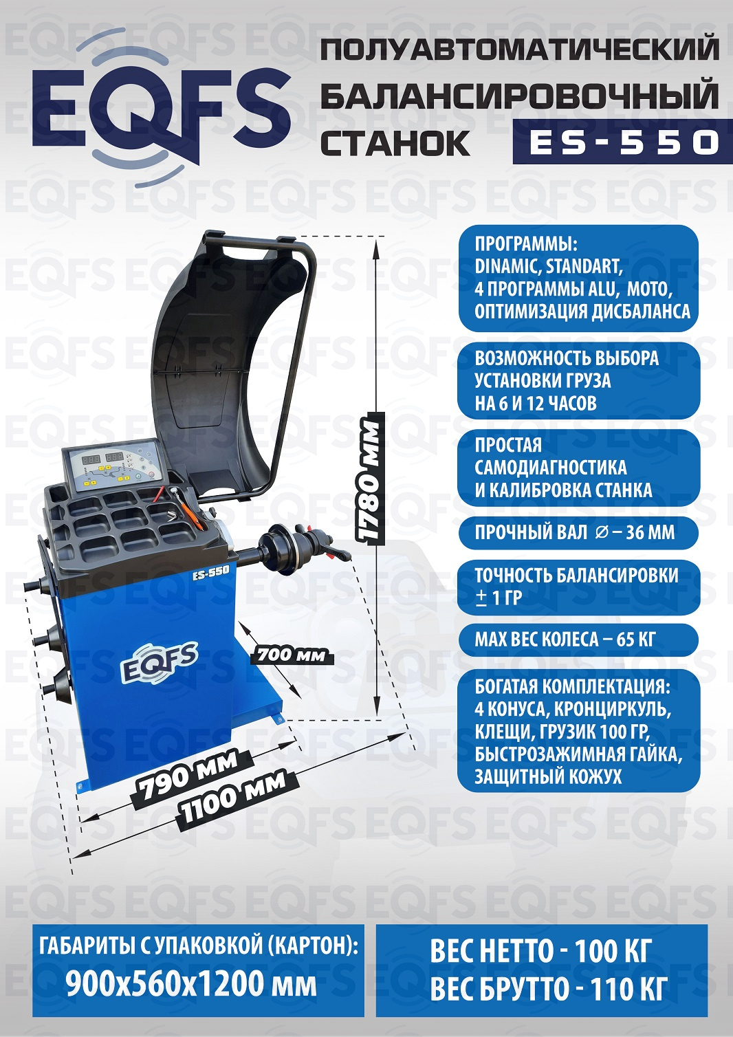 + ES-550 Балансировочный станок. Полуавтомат. Удобный и понятный интерфейс. Автозапуск опусканием кожуха. Автоматический ввод дистанции и диаметра диска. Лазерная навигация. Автокалибровка. Для колес легковых автомобилей, мотоциклов, «Газелей», «Спринтеров» с диаметром диска с резиной до 800 мм. Размеры диска: ширина 3–10” (76-254 мм), диаметр диска 10–24” (254÷609 мм). Вес ≤ 65 кг. Вал- 36 мм. Точность ±1гр. 220 В. Режимы работы DINAMIC, STATIC, ALU1, ALU2, ALU3, ALUS, ST. Гарантия 12 мес. В комплекте: кожух с автозапуском + клещи + кронциркуль + быстрозажимная гайка + набор конусов.