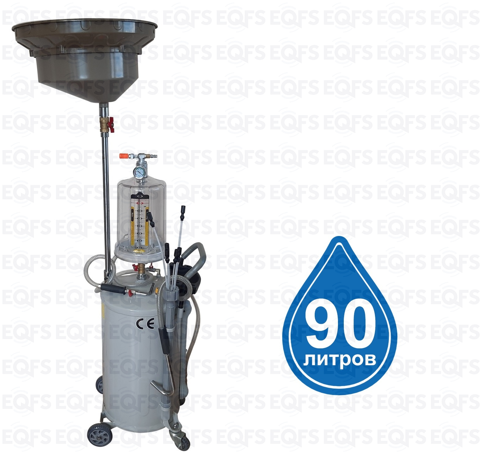 TS-2097 маслосборника для слива самотёком или вакуумной откачки масла и антифриза через щуп из ДВС, КПП и дифференциалов всех авто. В комплекте: Колба с особо прочным пластиком. Сливная чаша с сеткой для улавливания мелких деталей. Щупы гибкие 6 шт. Лоток для сливной пробки. Прозрачная трубка контроля в защитном кожухе. Металлические пистолеты для откачки масла. Быстросъёмный штуцер для пневмолинии. Сепаратор для выхода воздуха. Вмещает 90 л. = Бак 70л + колба 10 л. + сливная воронка 10л.