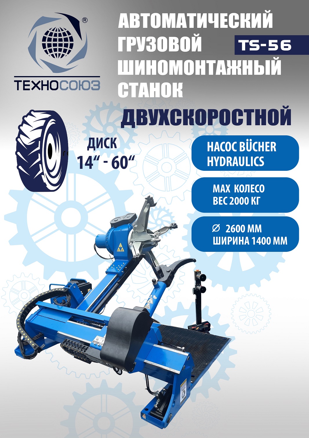 Грузового автоматического шиномонтажного станка TS-56 до 60". Двухскоростной. Моторы 4 + 4 кВт. Гидравлический насос – «BUCHER HIDRAULICS». Диски ALU, сталь, с кольцом и без 14÷60”. Колесо макс. Ø2600 мм, делает колеса "спарку" с шириной диска до 1400 мм. Вес колеса до 2000 кг. Гарантия до 18 мес. Для тракторов, комбайнов, лесной и карьерной техники