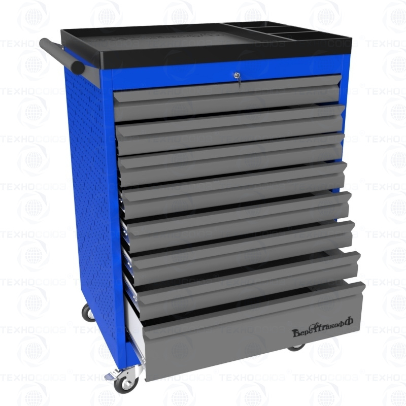 Тележки инструментальные серии PROFFI 950 предназначены для использования на предприятиях любого профиля занятых ремонтом и изготовлением различной продукции. На боковые стенки инструментальной тележки нанесена перфорация размером 25х25 мм и диаметром отверстия 8 мм, что позволяет устанавливать на них навесной инструмент или крючки. Наибольшей популярностью тележки инструментальные пользуются в сфере авторемонта и обслуживания автомобилей .Тележки имеют выдвижные ящики на шариковых телескопических направляющих полного выдвижения с фиксацией в закрытом положении, предотвращающее открывание при передвижении тележки. Ящики имеют центральный замок, который позволяет ограничить доступ посторонних лиц к содержимому ящиков. Тележка инструментальная изготовлена из высококачественного металла ведущих Российских производителей, покрашена порошковой краской производства Германии, имеет итальянскую и турецкую фурнитуру. Тележки для инструмента оснащены двумя не поворотными колесами диаметром 100 мм, одним поворотным и одним поворотным со стопором, которое фиксирует тележку и предотвращает непроизвольное скатывание.