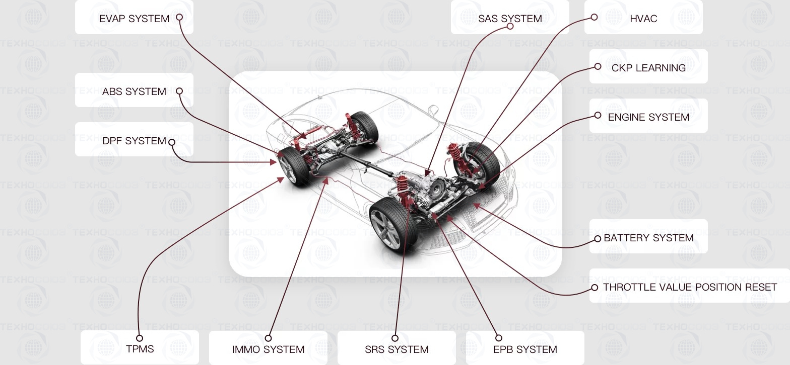 Дополнительные и сервисные программы: VIN decoding, OBDII, RESETOIL, RESETDPF, RESETSAS, RESETBRAKE, RESETBMS, RESETTPMS, RESETSUS, RESETSUN, RESETINJEC, RESETIMMO, RESETETS, RESETEGR, RESETBOX, , RESETBLEED, RESETAFS