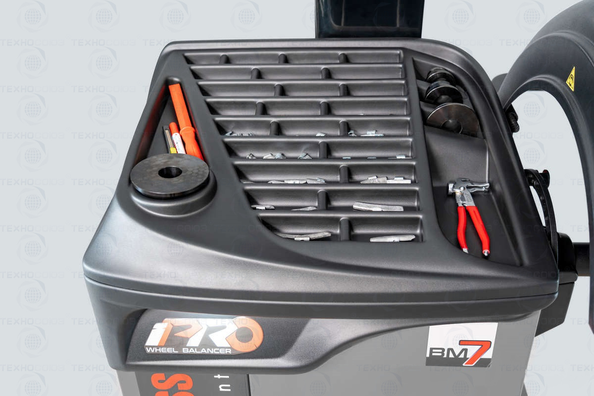 • Основная рабочая поверхность содержит более 30 универсальных ячеек для хранения балансировочных грузов, конусов и других приспособлений.
