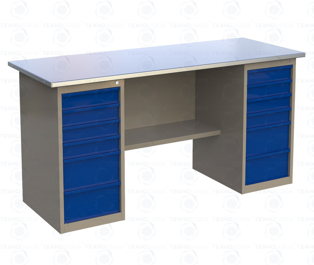 Верстак двухтумбовый 1800 ML6/ML6 поставляется в разобранном виде (4 элемента). Нагрузка на столешницу до 600 кг. Стандартный цвет: корпус - серый глянец RAL 7030, ящики и двери тумб - синий RAL 5017. Размеры:855x1800x700 мм. Масса: 127 кг.