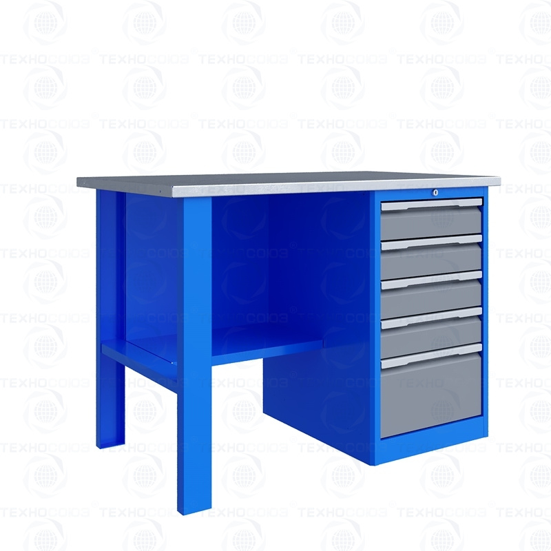 Тумба верстака - сварная. Ящики в тумбе устанавливаются на шариковых телескопических направляющих полного выдвижения. В тумбе P5 установлено четыре малых и один большой ящика. Внутренние размеры малых ящиков (ВхШхГ), не более: 103 х 397 х 520 мм. Внутренние размеры больших ящиков (ВхШхГ), не более: 222 х 397 х 520 мм. Тумбы с ящиками снабжены общим центральным замком с поворотом ригеля 180 градусов и подпружиненной тягой. В комплекте два ключа.